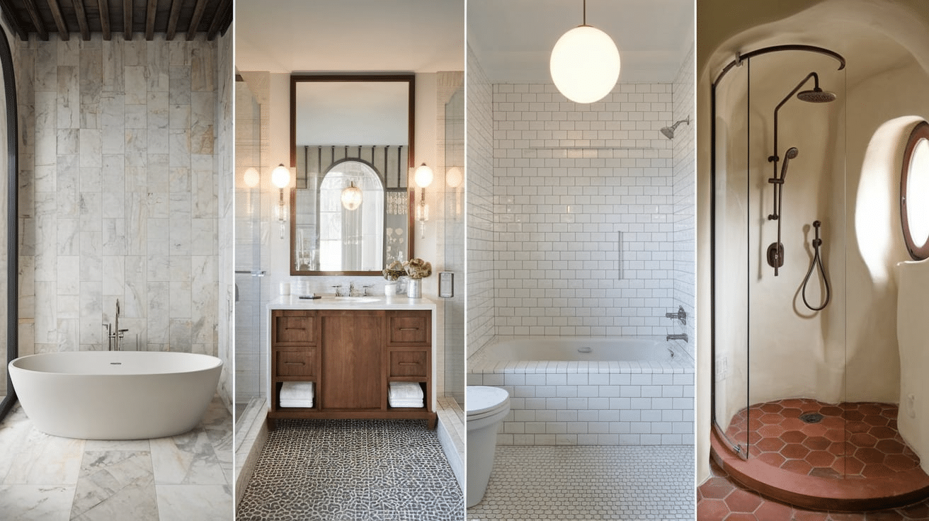 Douche à l'italienne, double vasque, sèche-serviette, carrelage grand format.